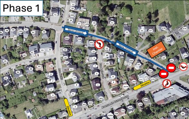 En raison de travaux routiers, la rue de Schouweiler à Bascharage sera mise en sens unique du lundi 13 avril 2026, 6h00 au jeudi 30 juillet 2026, 16h00.
